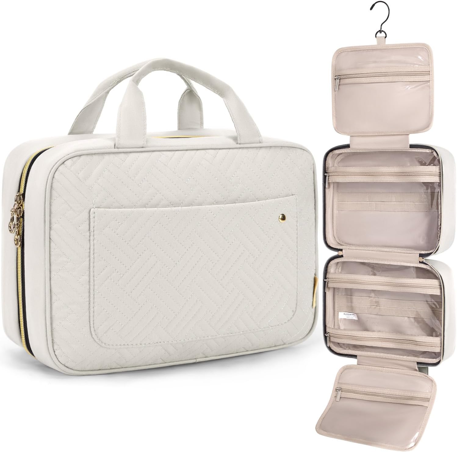 Customers find this toiletry bag spacious, with multiple compartments and wide spaces for larger bottles, making it perfect for frequent travelers and short trips. The bag is well-made with a chic beige aesthetic that matches jewelry organizers, and features a hanging feature that allows it to be placed anywhere. They appreciate its organization capabilities, with separate compartments for different items, and one customer notes the thoughtful design of the interior spaces.