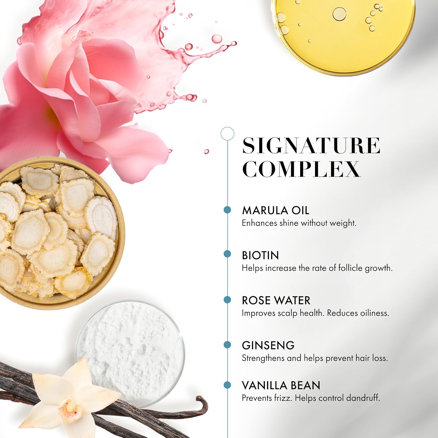Biotin & Botanical Blend – Biotin supports the look of fuller strands, while marula oil, white truffle, and vanilla bean nourish and boost shine. Ginseng helps improve manageability. Light Tropical Citrus scent.