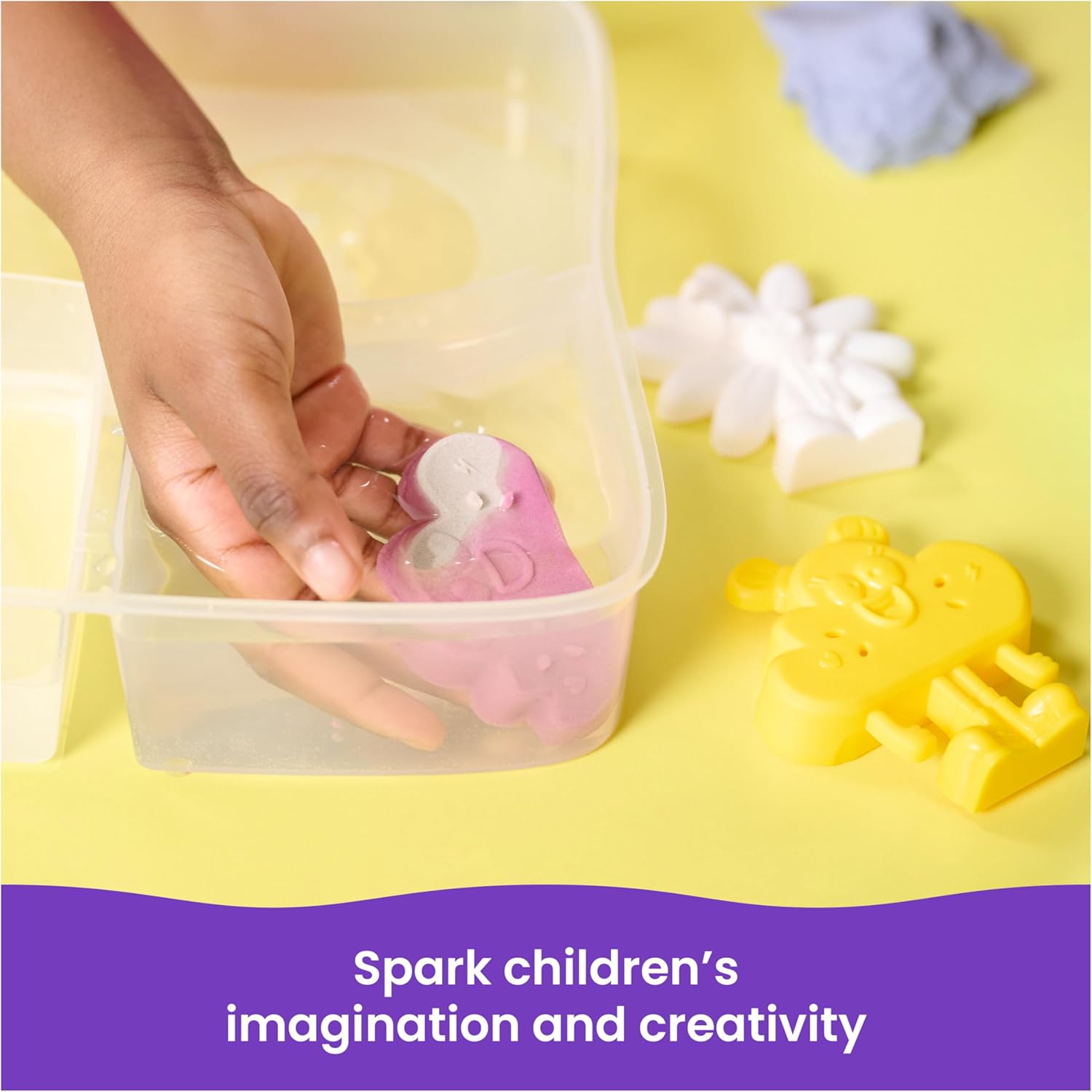 Splash into fun with the Kinetic Sand Splash Water Play Sandbox. This sand box provides an exciting hands-on water and sensory sand experience, featuring 12oz color-change Kinetic Sand Splash sand in 2 colors, a play tray and 4 tools and molds to inspire imagination and creativity. The tray keeps water, sand and play contained – fill the compartments with warm and cold water, turn the sand pink and blue in cold water and change it back to white in warm water. As kids shape, mold and stretch, they’ll discover surprise character reveals with sun and flower molds, and find more ways to play by mixing colors to make purple, using the water dropper to “paint” sand or a cloud to mimic falling rain. Kinetic Sand Splash sand aids the development of fine motor skills and sensory skills, and is suitable for individual or group play, encouraging social interaction. It’s made from natural sand, never dries out and sticks together for easy cleanup. Do not mix regular Kinetic Sand and Splash sand. The Water Play Sandbox is a must-have gift for any occasion and is an engaging craft kits alternative to modeling clay and building toys. Add it to your collection.