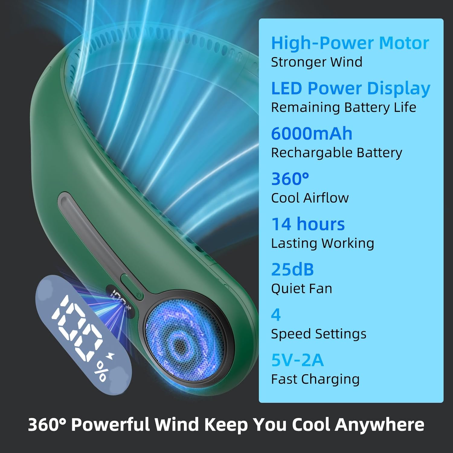 【Upgraded Cooling Performance】: Our neck fan has two high-power motor, delivering a 360° powerful airflow that cools your neck and face instantly. The upgraded air volume is 150% stronger, ensuring rapid cooling even in extreme heat.