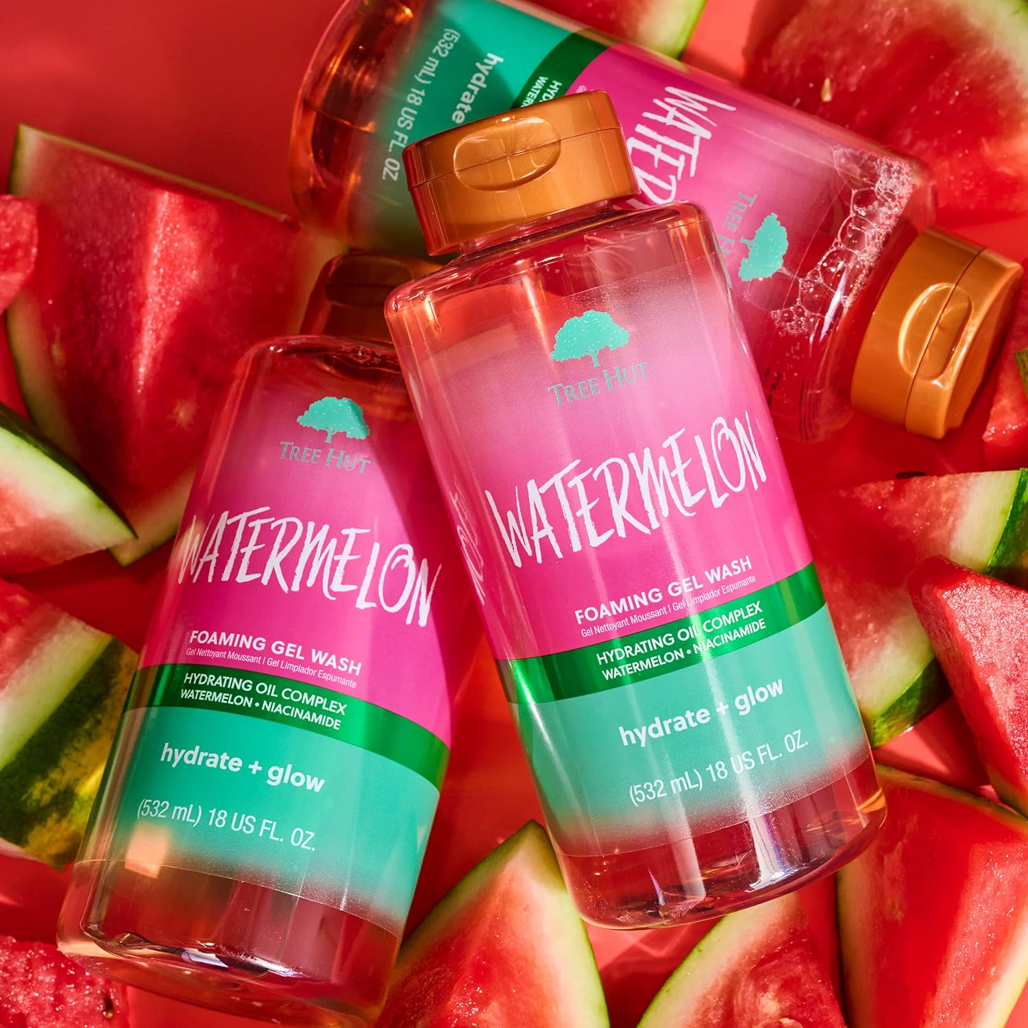 Our Tree Hut Watermelon Foaming Wash contains watermelon, which is rich in vitamins and antioxidants known to help protect damaged skin and help reveal younger-looking skin. It also contains niacinamide, which is known to help reduce inflammation and minimize the appearance of pores. Natural shea butter is known to deeply moisturize, nourish, and soften dry skin while helping to promote elasticity.