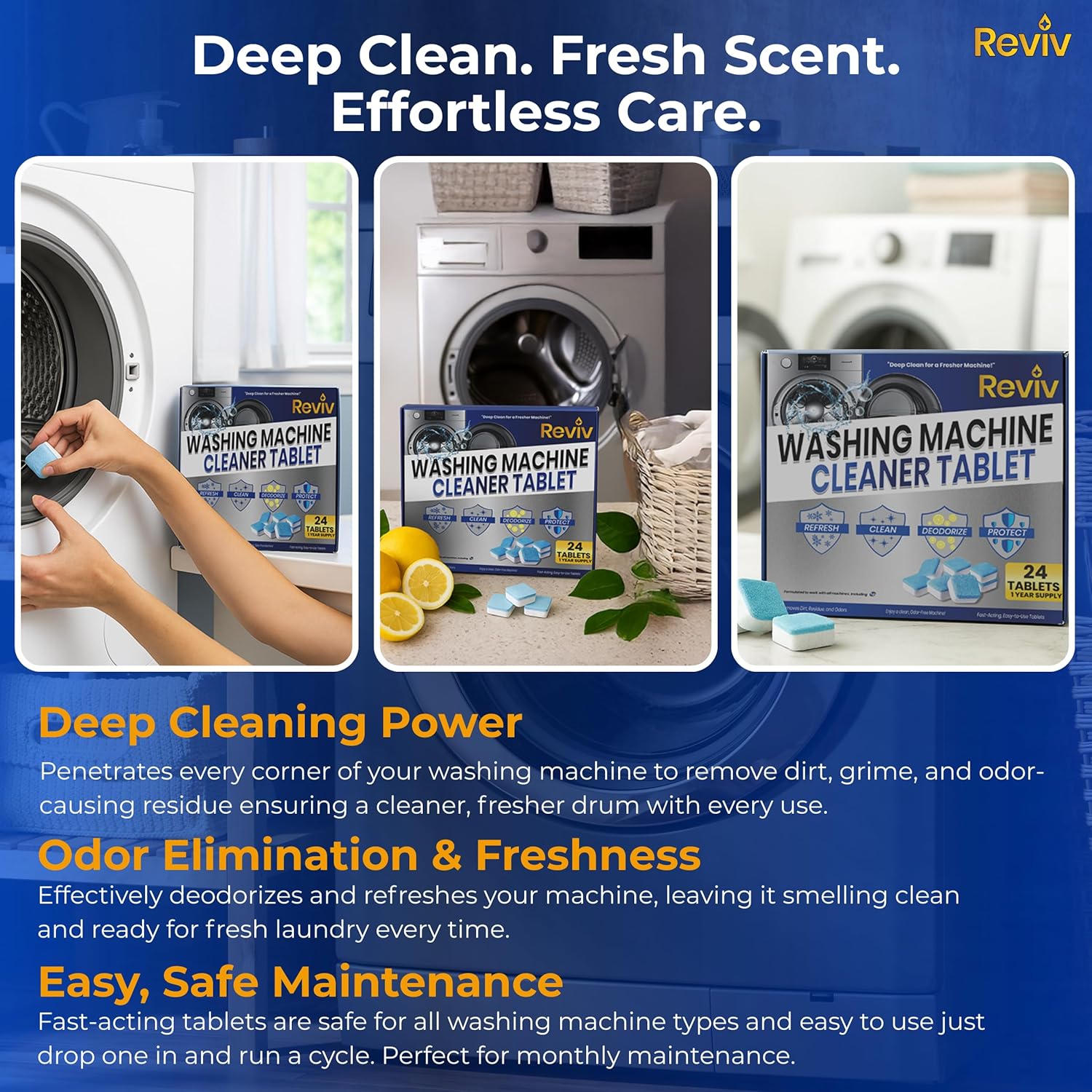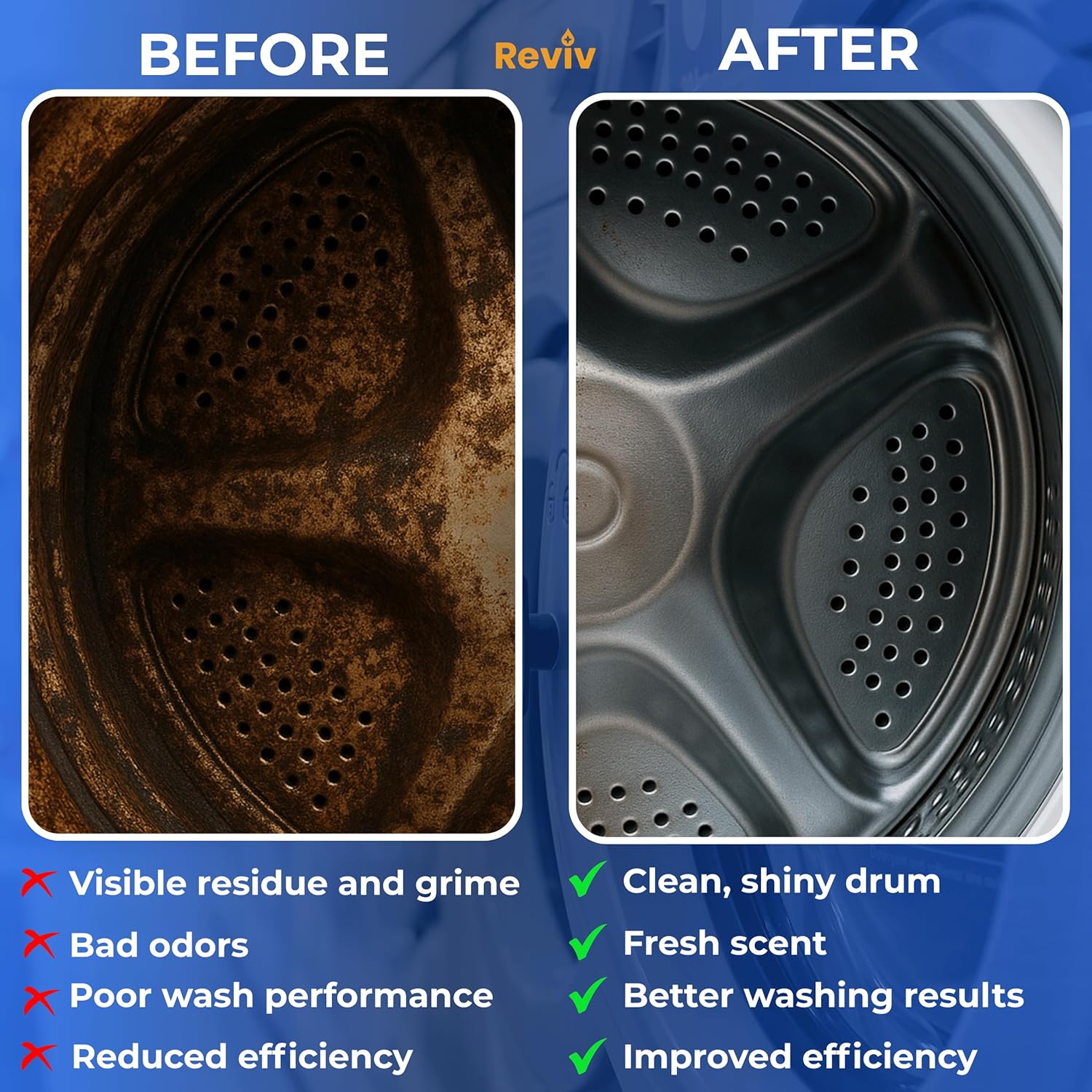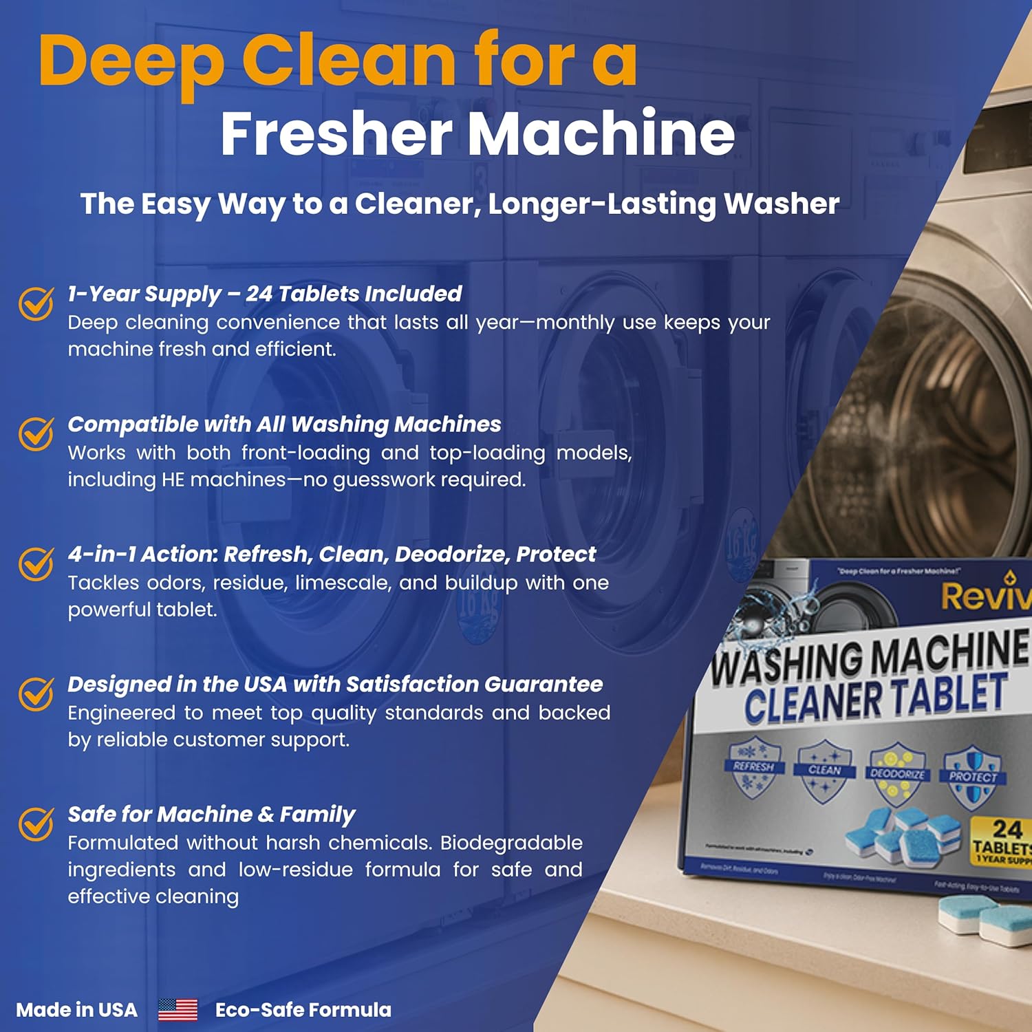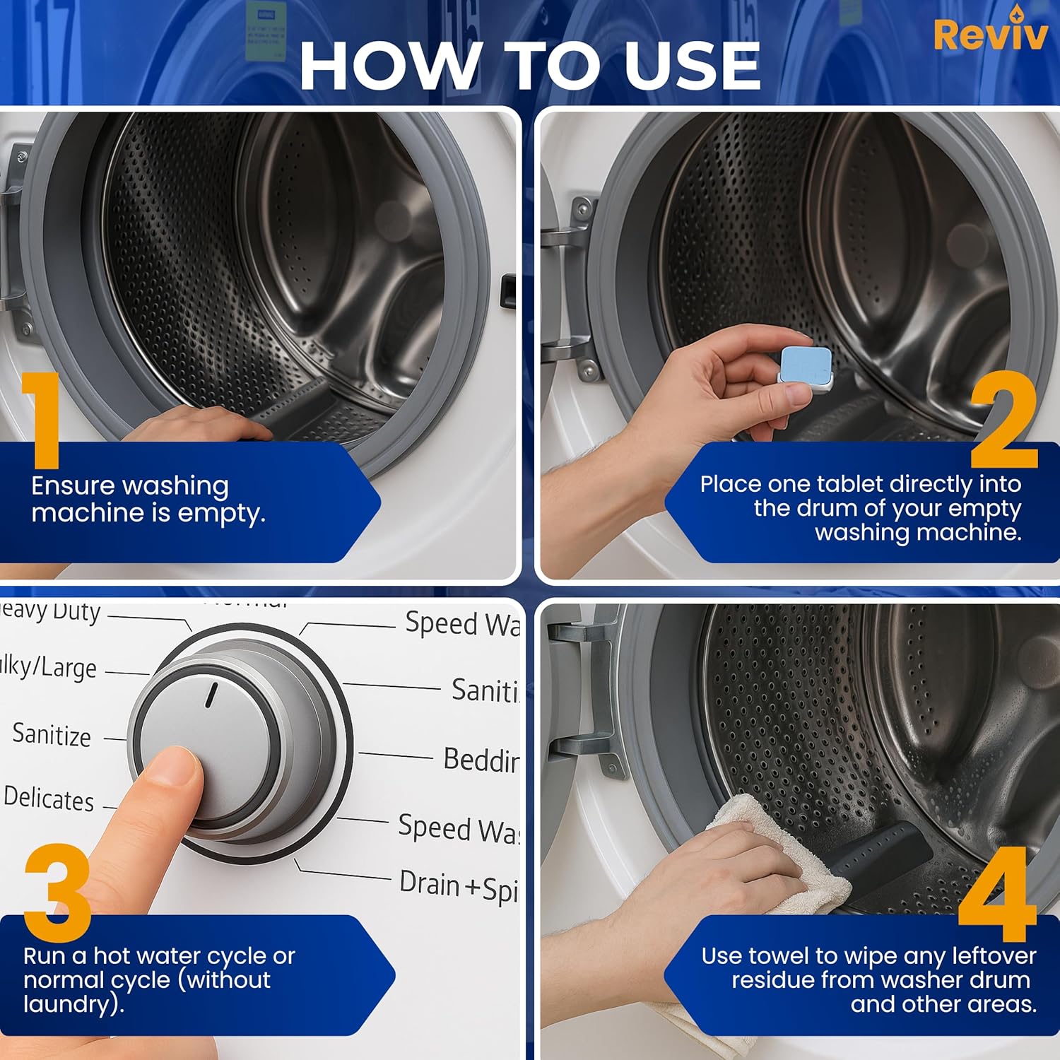 Powerful Deep Cleaning Action – Tackle stubborn buildup, soap scum, dirt, and musty odors with our highly concentrated formula. Each tablet dissolves completely to clean deep inside the drum, gasket, and internal components for a fresher, more efficient washer.