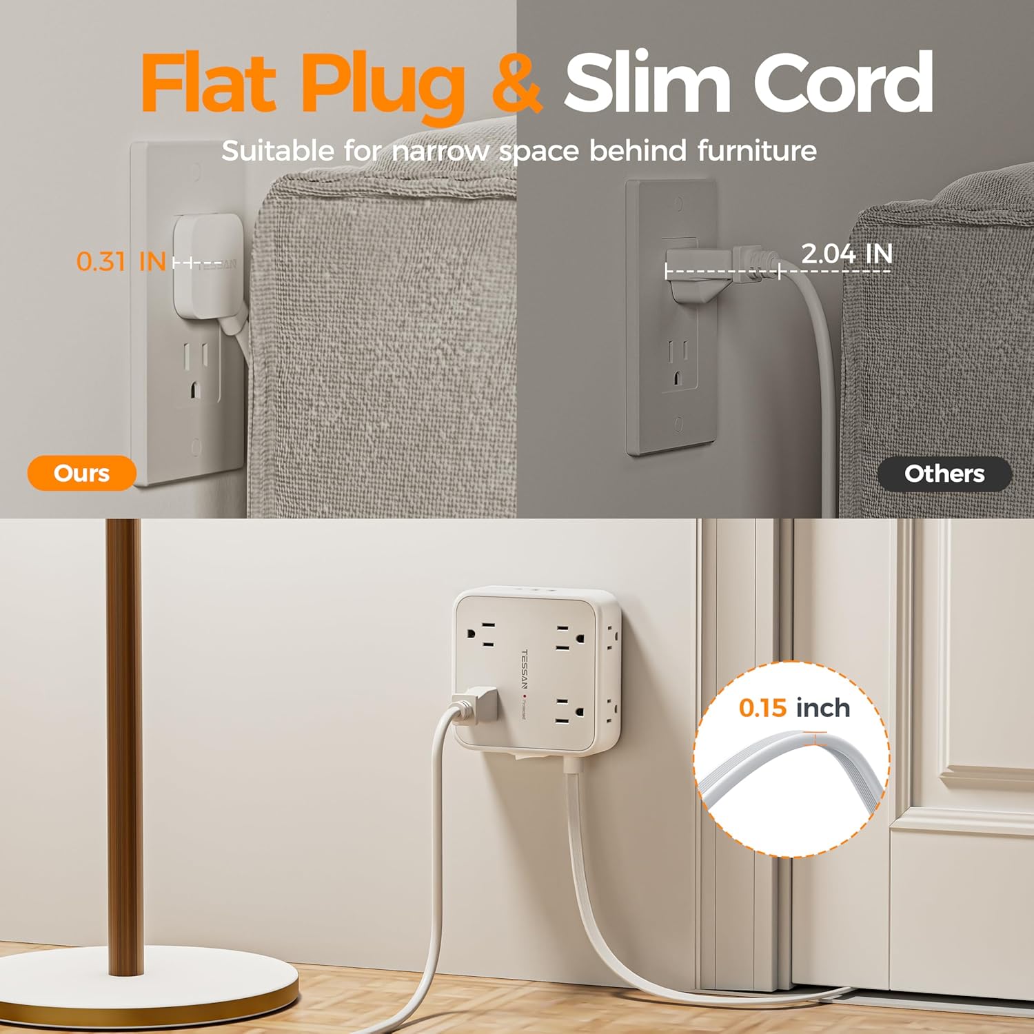 The 0.31 inch ultra slim flat plug fit in narrow spots and hide behind furniture like sofa, bed, sitting flush and nightstand, against the wall; Extension cord with USB ports can save your outlet space occupied.